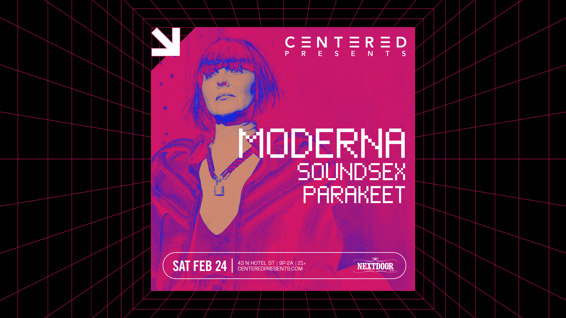 Centered presents, MODERNA BIO: Moderna's style is described as a dark heady blend of Techno, Dark Disco, Elektro, and Acid with wrought darkened vocals that has become her signature distinction. Beginning at a young age in a noise band, 'The Static Cult', she quickly fell in love with her passion for an underground unique sound.After ... Read moreMODERNA @ Nextdoor