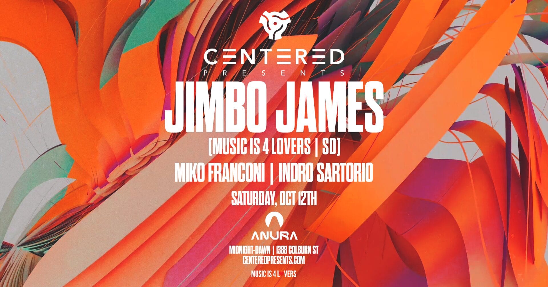 Saturday, Oct 12th CENTERED PRESENTS, JIMBO JAMES (MUSIC IS 4 LOVERS | SD) Bio: Jimbo James harnessed the funk at an early age growing up in Chicago. The son of a badass bass player, young James was raised on groovy rock ‘n’ roll of the 80’s; bands like Steely Dan, Led Zeppelin, Little River ... Read moreJIMBO JAMES (Music is 4 Lovers) @ ANURA